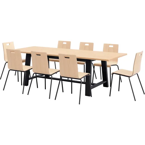 KFI Studios Jive 96"x 36" Dining Table Set, 8 Natural Cafe Chairs, Maple Top/Black Frame
