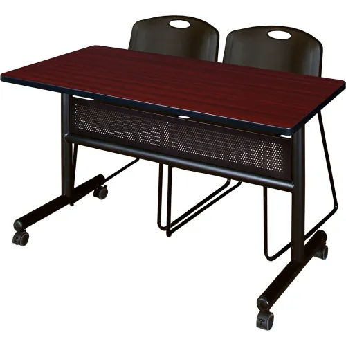 Regency® Kobe Privacy Nesting Table with 2 Zeng Black Stack Chairs, 48"L x 24"W, Mahogany