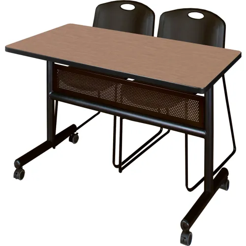 Regency® Kobe Privacy Nesting Table with 2 Zeng Black Stack Chairs, 48"L x 24"W, Noble Oak