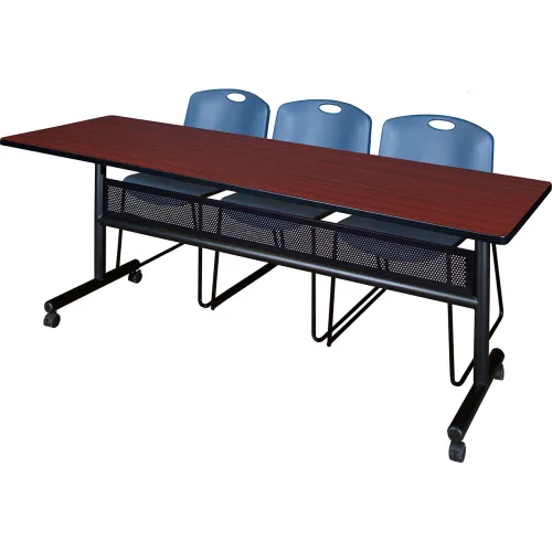 Regency® Kobe Privacy Nesting Table with 2 Zeng Blue Stack Chairs, 84"L x 24"W, Mahogany