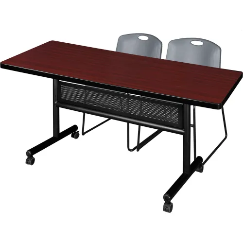 Regency® Kobe Privacy Nesting Table with 2 Zeng Gray Stack Chairs, 72"L x 30"W, Mahogany