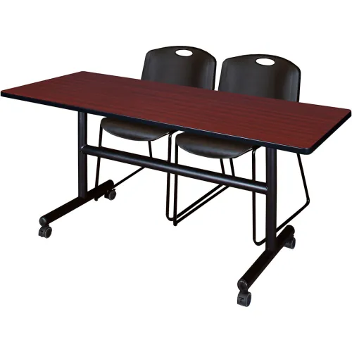 Regency® Kobe Training Nesting Table with 2 Zeng Black Stack Chairs, 60"L x 24"W, Mahogany