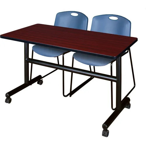 Regency® Kobe Training Nesting Table with 2 Zeng Blue Stack Chairs, 48"L x 24"W, Mahogany