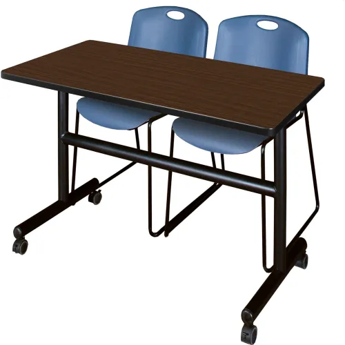 Regency® Kobe Training Nesting Table with 2 Zeng Blue Stack Chairs, 48"L x 24"W, Neo Walnut