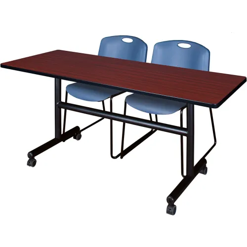 Regency® Kobe Training Nesting Table with 2 Zeng Blue Stack Chairs, 60"L x 30"W, Mahogany