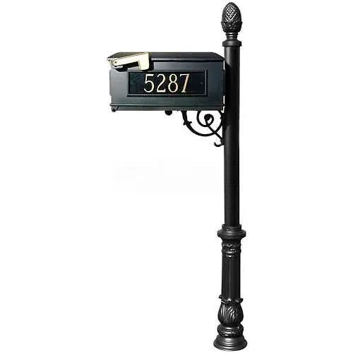 Lewiston Mailbox, Post (Ornate Base & Pineapple Finial), w/3 Address Plates, Support Brace, Black
