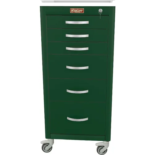 Harloff M-Series Narrow Procedure Cart, 6 Drawers, Key Lock, 18"W x 18"L x 40-3/4"H, Forest Green