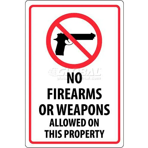 NMC M452G Security Sign, No Firearms Or Weapons Allowed On This Property, 18" X 12", White/Red/Black