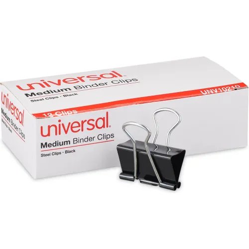 Universal® Medium Binder Clips, Steel Wire, 5/8" Cap., 1-1/4" Wide, Black/Silver, Dozen