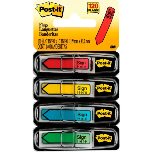 Post-it® Message Flags, "Sign Here", 1/2" Wide, Assorted, 30 Flags/Dispenser, 4 Dispensers/Pack