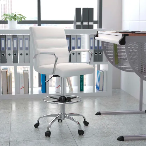 Flash Furniture Mid-Back LeatherSoft Drafting Chair, Adjustable Foot Ring, Chrome Base, White