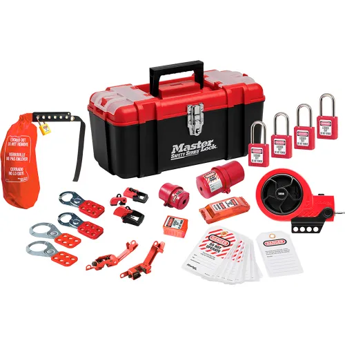 Master Lock® Lockout Toolbox, Premier Electrical Device Assortment, 4 Zenex Padlocks, Red