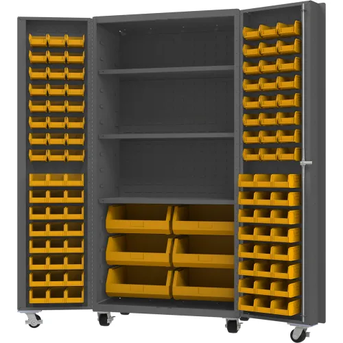 Durham Mfg.® Mobile HD Cabinet w/ 3 Shelves & 102 Yellow Bins, 14 Ga, 36"W x 24"D x 76"H