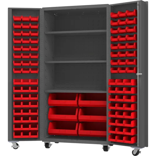 Durham Mfg.® Mobile Heavy Duty Cabinet w/ 3 Shelves & 102 Red Bins, 14 Ga., 36"W x 24"D x 76"H