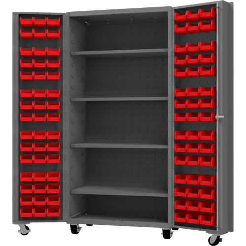 Durham Mfg.® Mobile Heavy Duty Cabinet w/ 4 Shelves & 96 Red Bins, 14 Ga., 36"W x 24"D x 76"H
