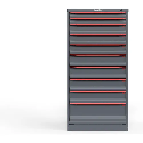 Strong Hold Modular Drawer Cabinet, 10 Drawers, 130 Compart, 30"W x 29"D x 60"H, Red Handle/Gray