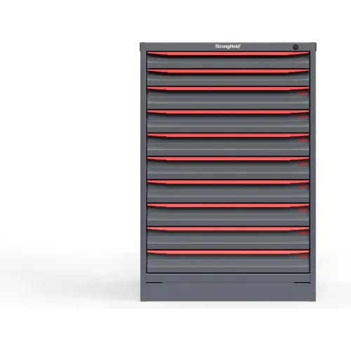 Strong Hold Modular Drawer Cabinet, 10 Drawers, 200 Compart, 30"W x 29"D x 44"H, Red Handle/Gray