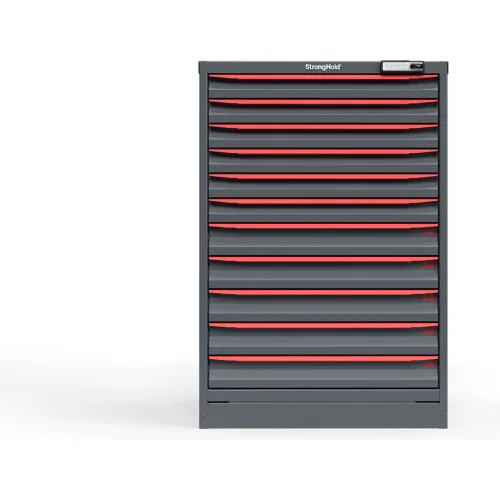 Strong Hold Modular Drawer Cabinet, 11 Drawers, 125 Comp., 30"W x 29"D x 44"H, Red /Gray, Elec. Lock