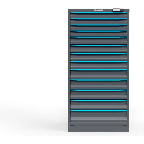 Strong Hold Modular Drawer Cabinet, 13 Drawers, 196 Comp., 30"Wx29"Dx60"H, Blue /Gray, Elec. Lock
