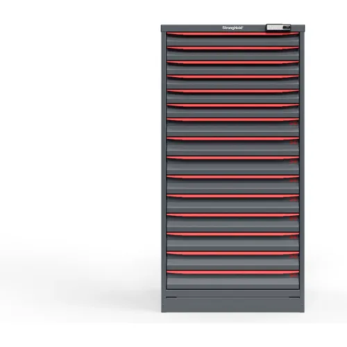 Strong Hold Modular Drawer Cabinet, 15 Drawers, 225 Comp., 30"W x 29"D x 60"H, Red /Gray, Elec. Lock