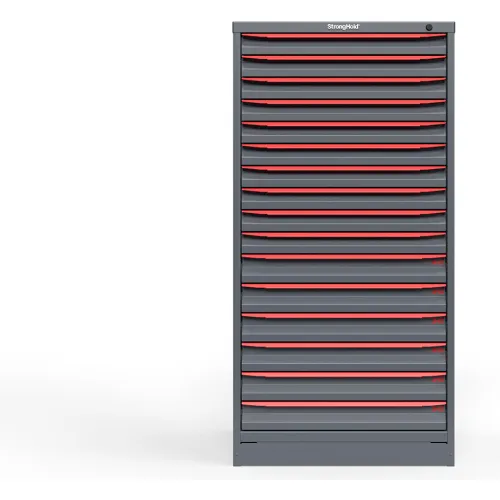 Strong Hold Modular Drawer Cabinet, 16 Drawers, 150 Compart, 30"W x 29"D x 60"H, Red Handle/Gray