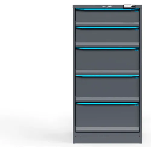 Strong Hold Modular Drawer Cabinet, 5 Drawers, 15 Comp., 30"W x 29"D x 60"H, Blue /Gray, Elec. Lock