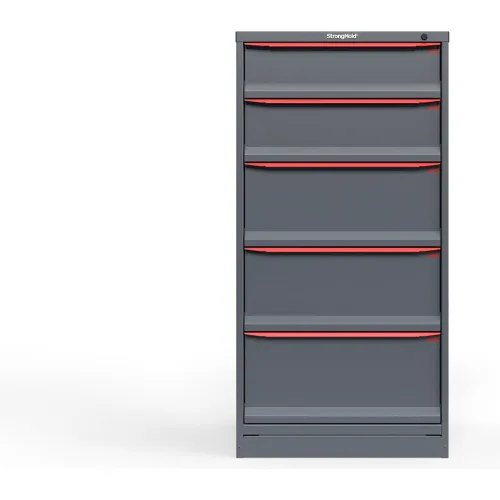 Strong Hold Modular Drawer Cabinet, 5 Drawers, 15 Compartments, 30"W x 29"D x 60"H, Red Handle/Gray