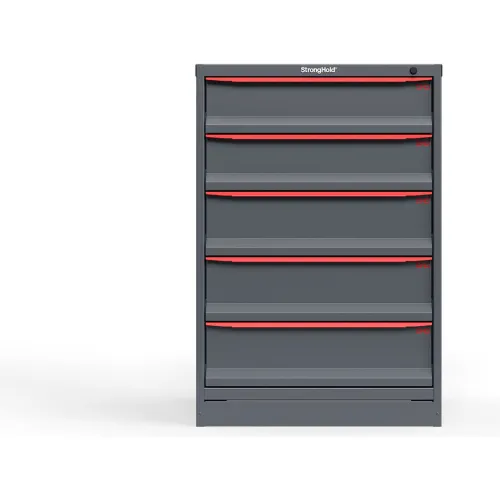 Strong Hold Modular Drawer Cabinet, 5 Drawers, 51 Compartments, 30"W x 29"D x 44"H, Red Handle/Gray