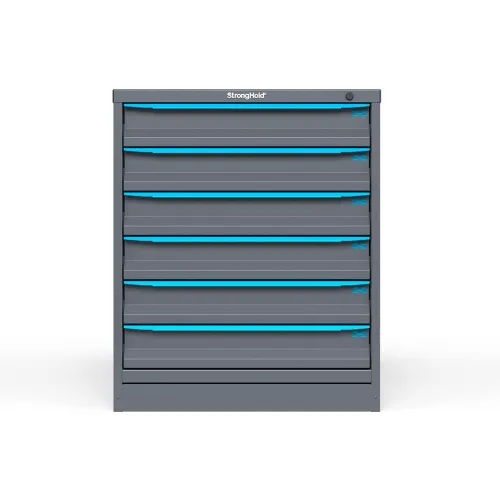 Strong Hold Modular Drawer Cabinet, 6 Drawers, 120 Compart, 30"W x 29"D x 36"H, Blue Handle/Gray