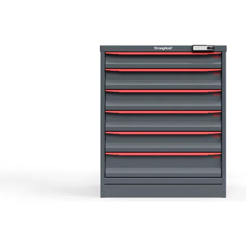 Strong Hold Modular Drawer Cabinet, 6 Drawers, 121 Comp., 30"W x 29"D x 36"H, Red /Gray, Elec. Lock