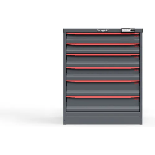 Strong Hold Modular Drawer Cabinet, 6 Drawers, 123 Comp., 30"W x 29"D x 36"H, Red /Gray, Elec. Lock
