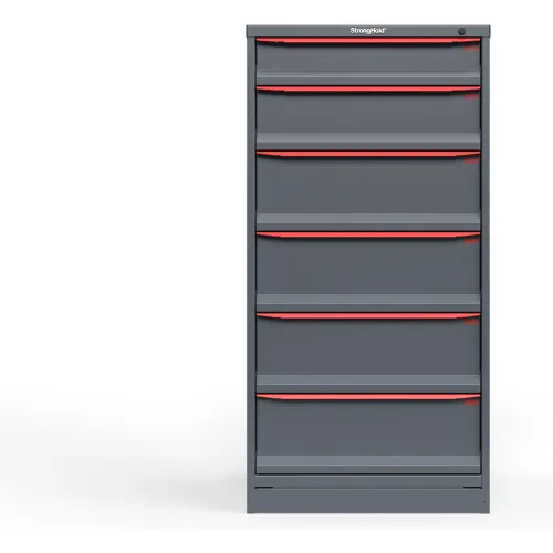 Strong Hold Modular Drawer Cabinet, 6 Drawers, 41 Compartments, 30"W x 29"D x 60"H, Red Handle/Gray