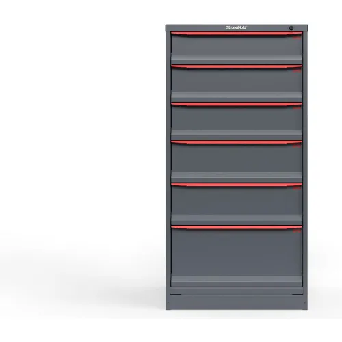 Strong Hold Modular Drawer Cabinet, 6 Drawers, 42 Compartments, 30"W x 29"D x 60"H, Red Handle/Gray