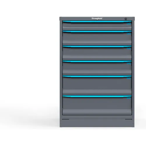 Strong Hold Modular Drawer Cabinet, 6 Drawers, 91 Compartments, 30"W x 29"D x 44"H, Blue Handle/Gray