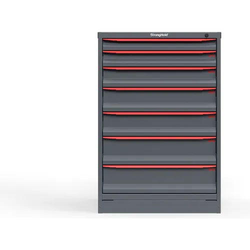 Strong Hold Modular Drawer Cabinet, 7 Drawers, 101 Compart, 30"W x 29"D x 44"H, Red Handle/Gray