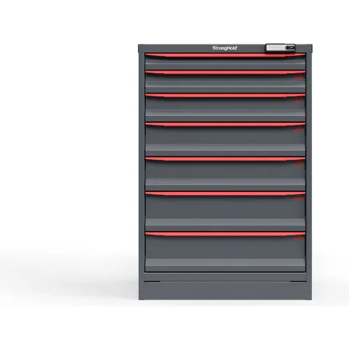 Strong Hold Modular Drawer Cabinet, 7 Drawers, 101 Comp., 30"W x 29"D x 44"H, Red /Gray, Elec. Lock
