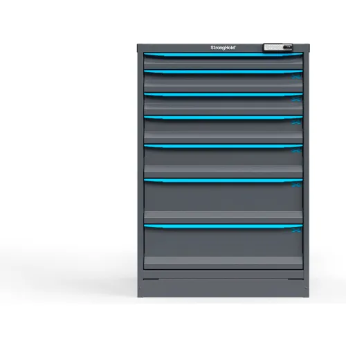 Strong Hold Modular Drawer Cabinet, 7 Drawers, 104 Comp., 30"W x 29"D x 44"H, Blue /Gray, Elec. Lock