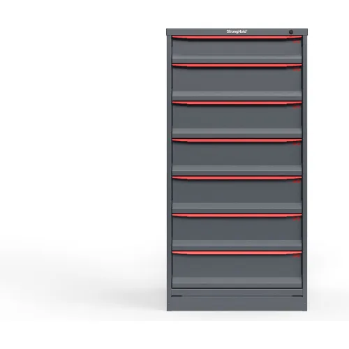 Strong Hold Modular Drawer Cabinet, 7 Drawers, 70 Compartments, 30"W x 29"D x 60"H, Red Handle/Gray