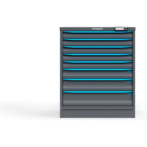 Strong Hold Modular Drawer Cabinet, 8 Drawers, 61 Comp., 30"W x 29"D x 36"H, Blue /Gray, Elec. Lock