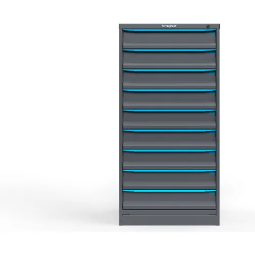 Strong Hold Modular Drawer Cabinet, 9 Drawers, 144 Compart, 30"W x 29"D x 60"H, Blue Handle/Gray