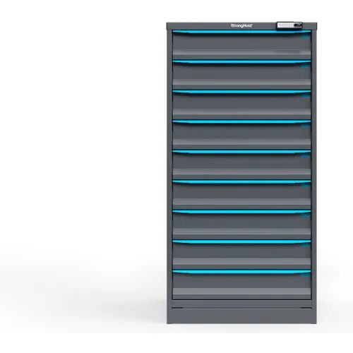Strong Hold Modular Drawer Cabinet, 9 Drawers, 144 Comp., 30"W x 29"D x 60"H, Blue /Gray, Elec. Lock