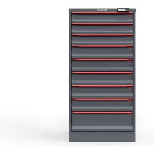 Strong Hold Modular Drawer Cabinet, 9 Drawers, 146 Comp., 30"W x 29"D x 60"H, Red /Gray, Elec. Lock