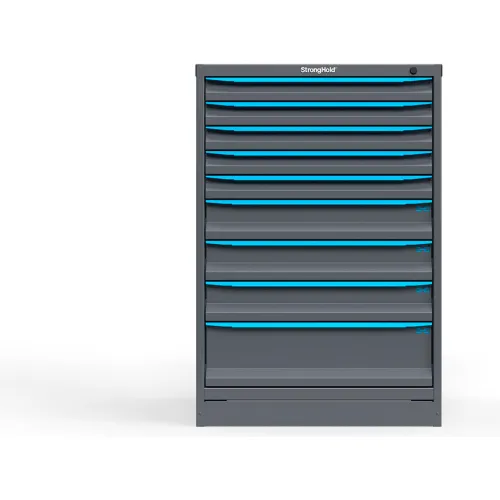 Strong Hold Modular Drawer Cabinet, 9 Drawers, 69 Compartments, 30"W x 29"D x 44"H, Blue Handle/Gray