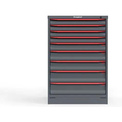 Strong Hold Modular Drawer Cabinet, 9 Drawers, 97 Compartments, 30"W x 29"D x 44"H, Red Handle/Gray