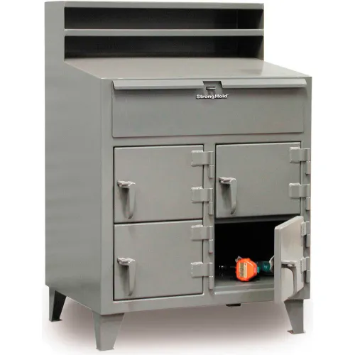 StrongHold 4 Person Cabinet Shop Desk, Drawer/Riser, Padlockable Doors, 48"W x 28"D, Gray