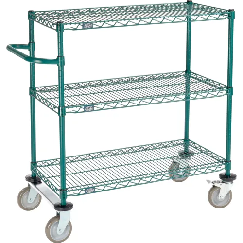 Nexel®, 3 Shelf, Push Cart, Poly-Green,36"W x 18"D x 40"H, Poly Casters,2 Rigid, 2 Brake