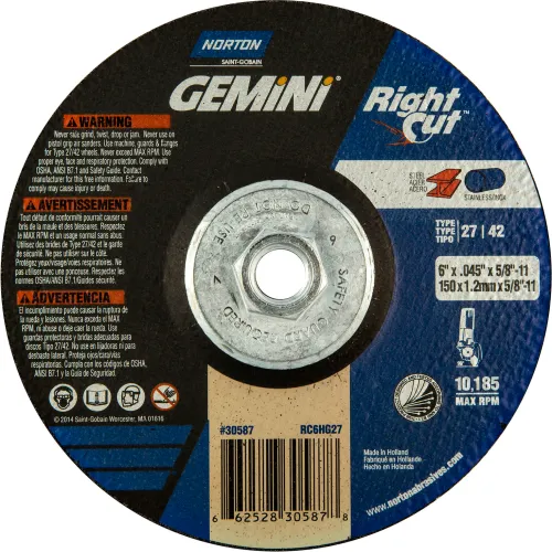 Norton 66252830587 Gemini Right Angle Cut-Off Wheel 6" x .045" x 5/8 - 11" 24 Grit Alum. Oxide T27 - Pkg Qty 10