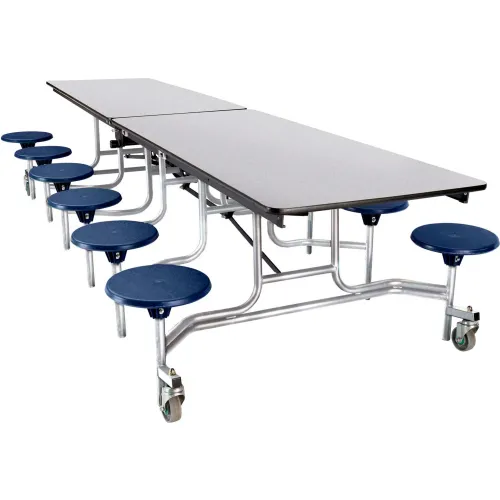 NPS® Mobile Cafeteria Table With Stools, 145"L x 59"W, Gray Top/Blue Stools/Chrome Frame