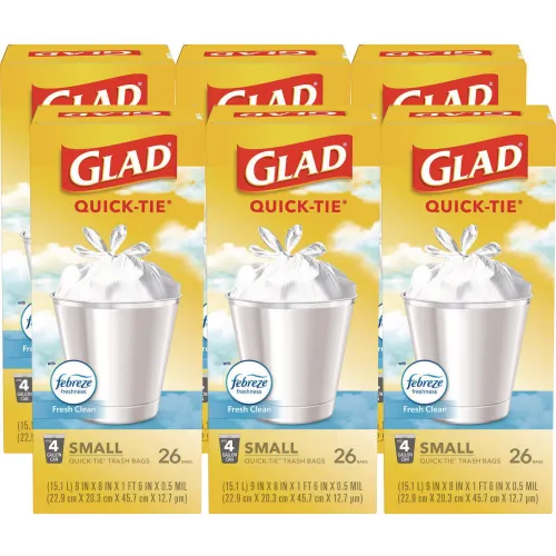 Glad® OdorShield Quick-Tie Small Trash Bags, 4 Gal, 0.5 mil, 8" x 18", White, 156/Case