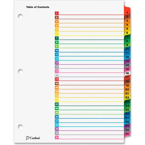 Cardinal OneStep Printable T.O.C. Divider, Printed 1 to 31, 9"x11", 31 Tabs, White/Multicolor